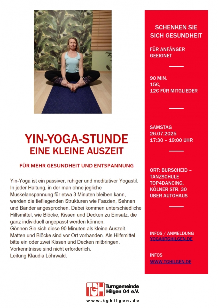 Yin-Yoga ist ein passiver, ruhiger und meditativer Yogastil. In jeder Haltung, in der man ohne jegliche Muskelanspannung für etwa 3 Minuten bleiben kann, werden die tiefliegenden Strukturen wie Faszien, Sehnen und Bänder angesprochen. Dabei kommen unterschiedliche Hilfsmittel, wie Blöcke, Kissen und Decken zu Einsatz, die ganz individuell angepasst werden können. Gönnen Sie sich diese 90 Minuten als kleine Auszeit. Matten und Blöcke sind vor Ort vorhanden. Als Hilfsmittel bitte ein oder zwei Kissen und Decken mitbringen. Vorkenntnisse sind nicht erforderlich. Leitung Klaudia Löhrwald.